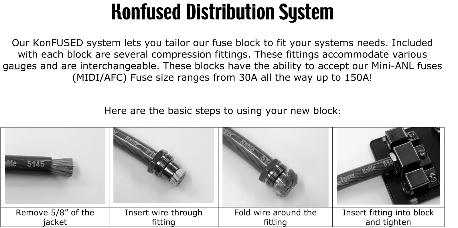 Our KonFused compression fitting termination offers the highest level of surface contact area. Better connection means less resistance, which equals higher voltage to your system. The KonFused System also allows for multiple gauges to be used without any product modification. Please review our compression fitting PDF for questions regarding this design.