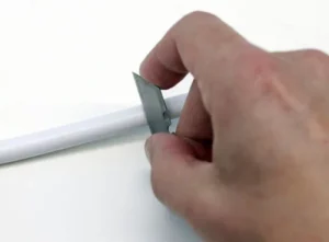 To install the speaker pants, I need to remove this main outer jacket. I removed 5-1/2″ of the jacket to expose the inner red and black insulated conductors. Using a razor blade, I rolled the cable on a flat surface holding the blade in one place. You do not need to apply a lot of pressure. The idea is to not damage the inner insulation of the cable. After scoring the speaker wire PVC jacket, I bend the area I just scored with the blade. Working the PVC jacket back and forth, the outer jacket will start to break apart. Additional light pressure on some parts of the seam maybe required.